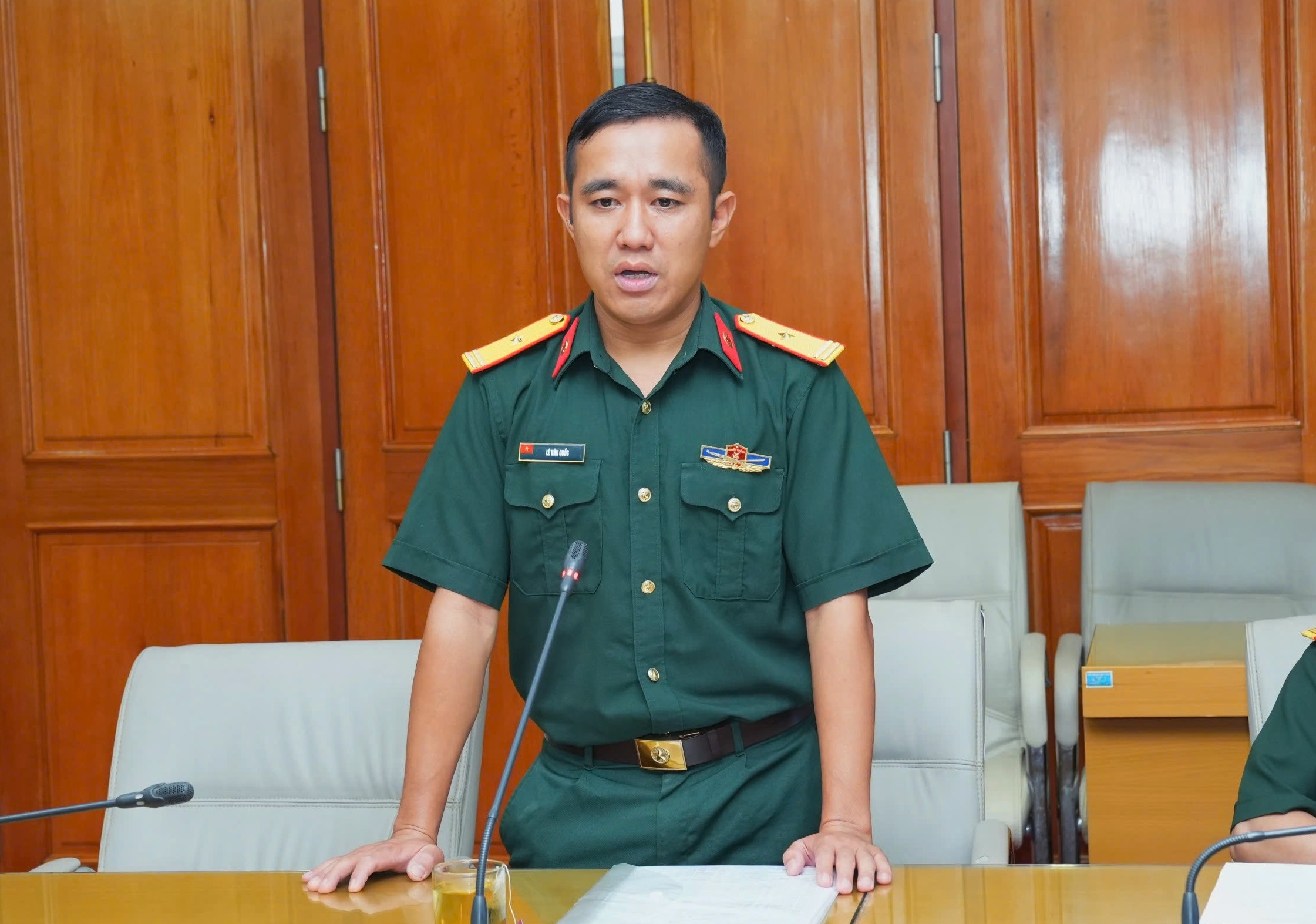 Thiếu tá ThS.BS Lê Văn Quốc thay mặt kíp quân y đợt I/2023 báo cáo kết quả thực hiện nhiệm vụ tại Bệnh xá Đảo Song Tử Tây