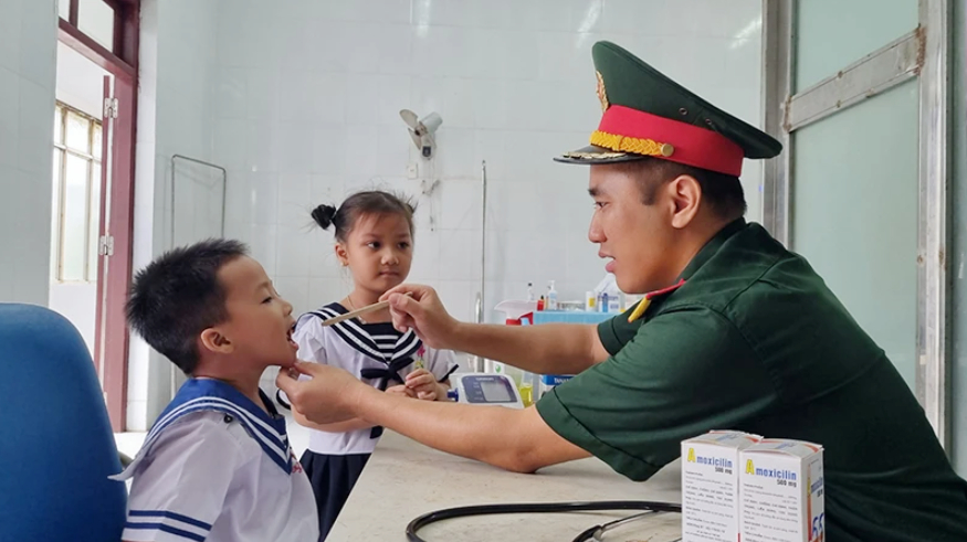 Thiếu tá ThS.BS Lê Văn Quốc - Bệnh xá trưởng đảo Song Tử Tây thăm khám cho các em nhỏ trên đảo (Nguồn: Báo Nhân dân)