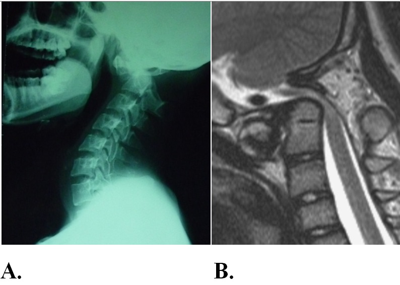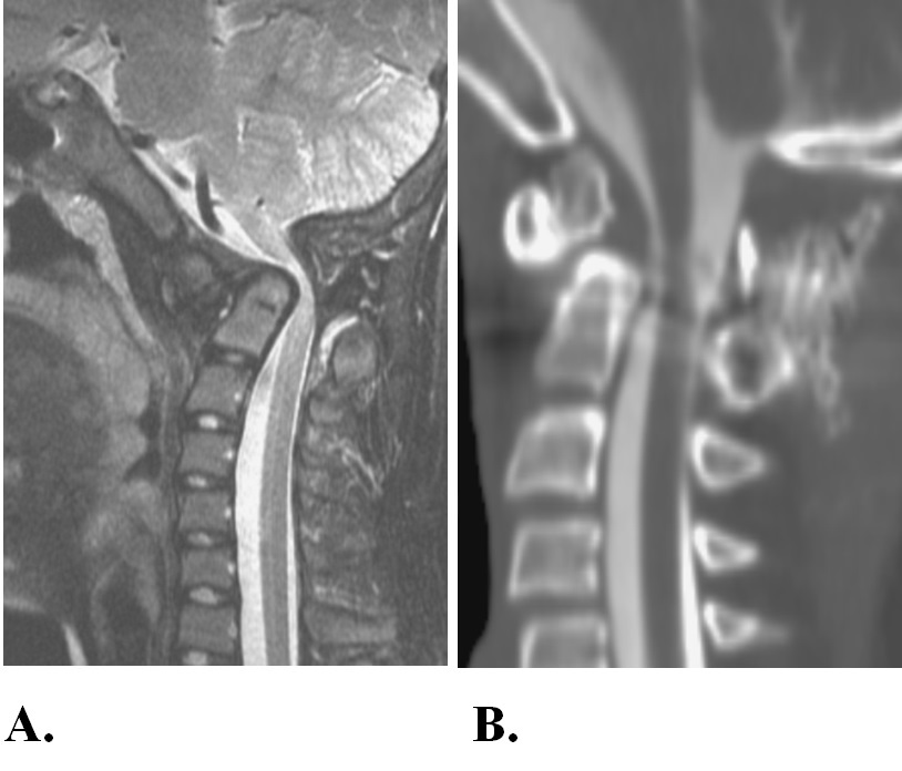 Hình 1. Hubet5555 chuẩn mã hóa SSL quốc tế nam, 33 tuổi. Năm 13 tuổi, đá bóng ngã, sau ngã liệt tứ chi, phục hồi dần. Trước khi vào viện 3 năm thấy tứ chi yếu dần. Vào viện trong tình trạng bại nặng tứ chi, tiểu qua sonde, khó thở nhẹ. Trên phim X-quang (A) có mất vững, biến dạng khớp đội - trục. Trên cộng hưởng từ (B), ống sống bị hẹp, tủy sống bị đè ép mức độ nặng.