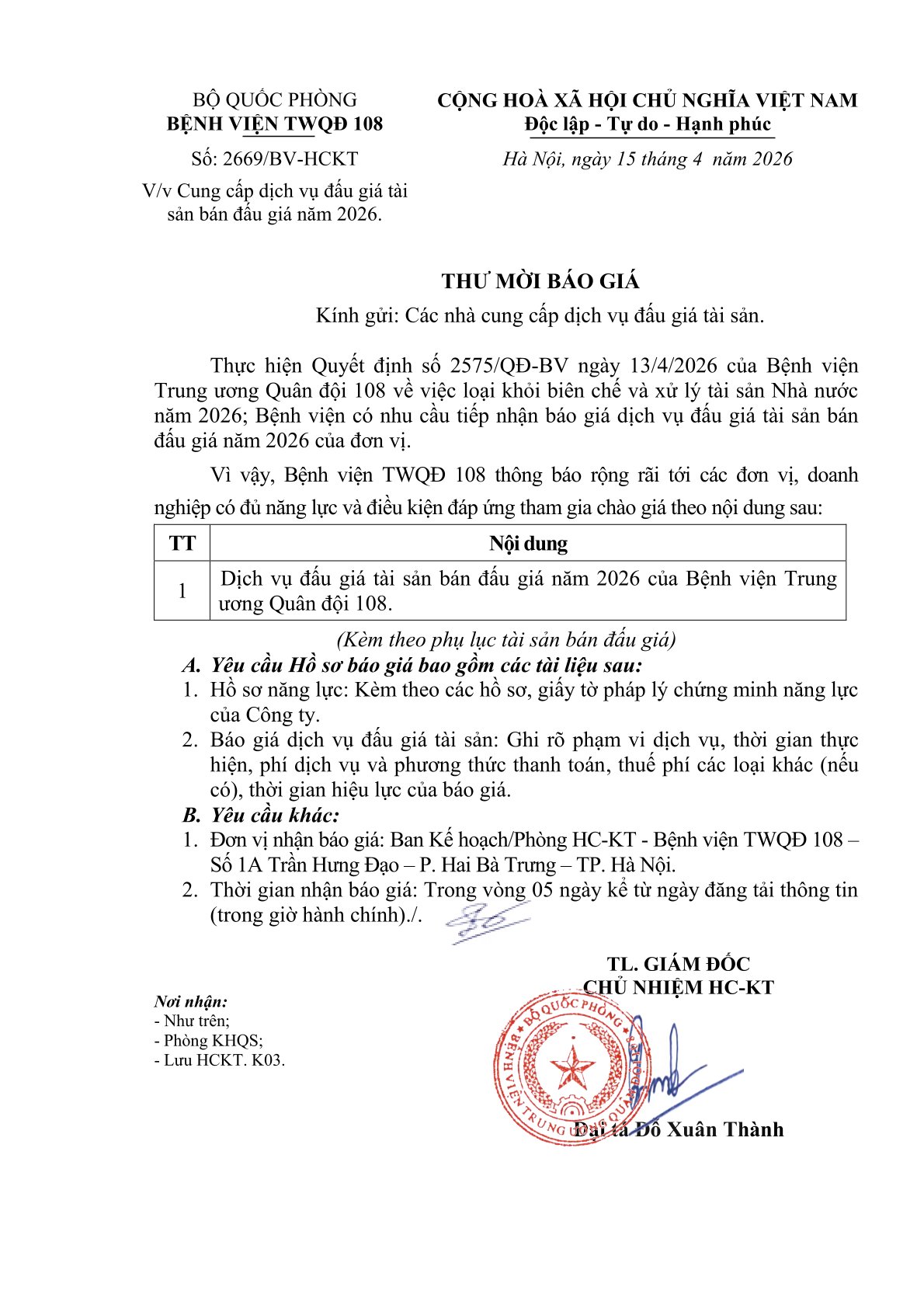 Thư mời chào giá số 2669: Cung cấp dịch vụ đấu giá tài sản bán đấu giá năm 2026