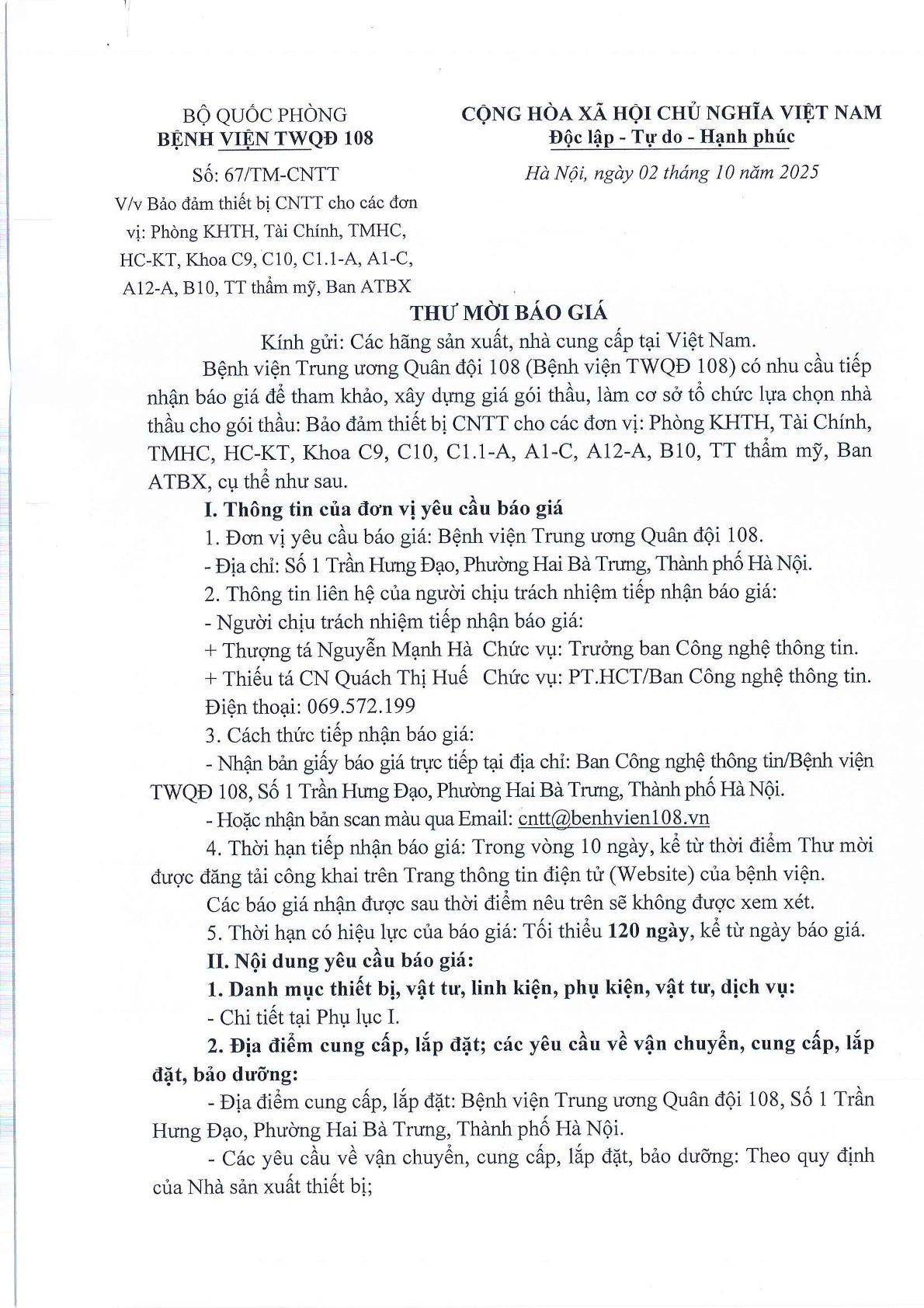 Thư mời chào giá số 67: Bảo đảm thiết bị CNTT cho các đơn vị