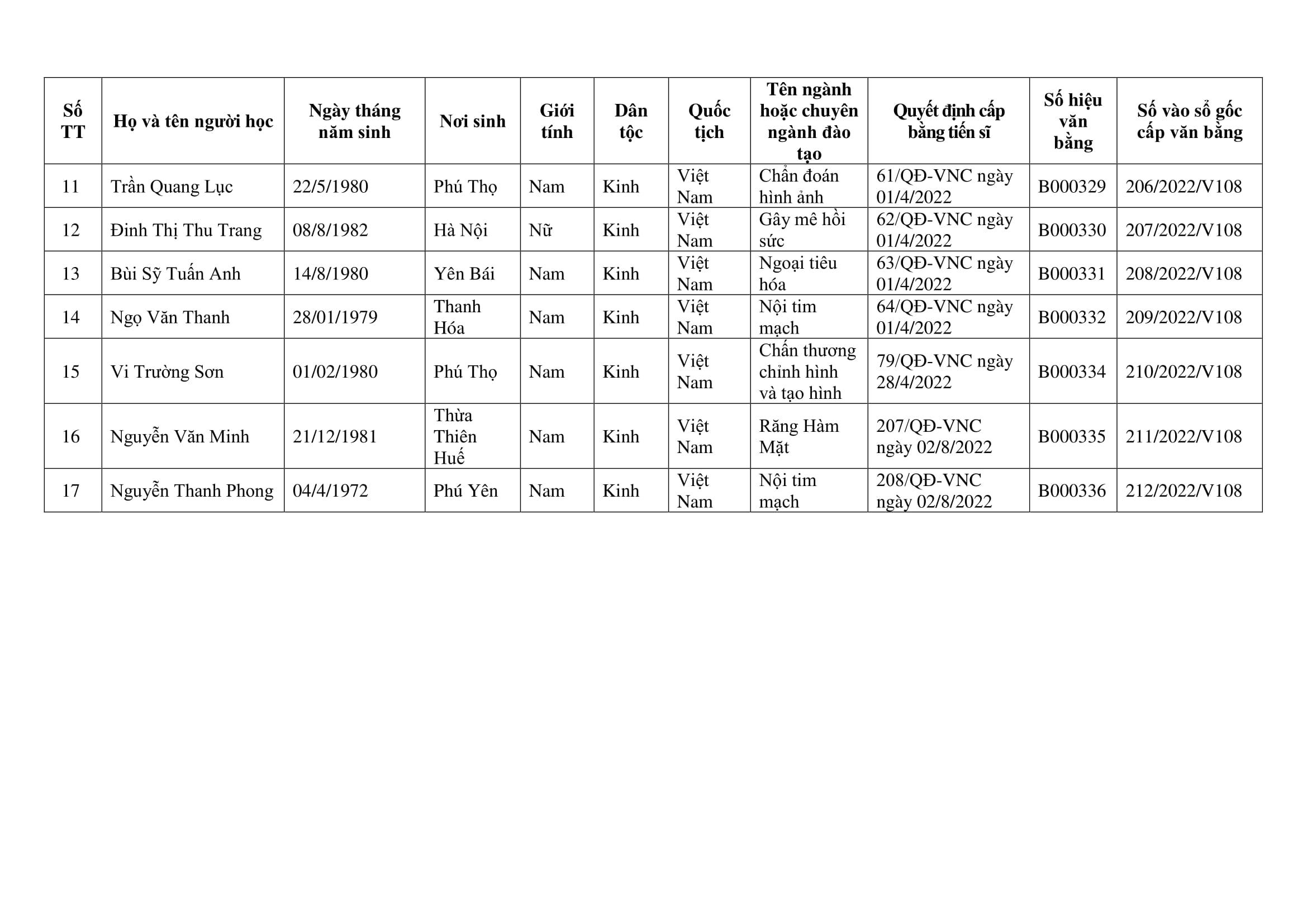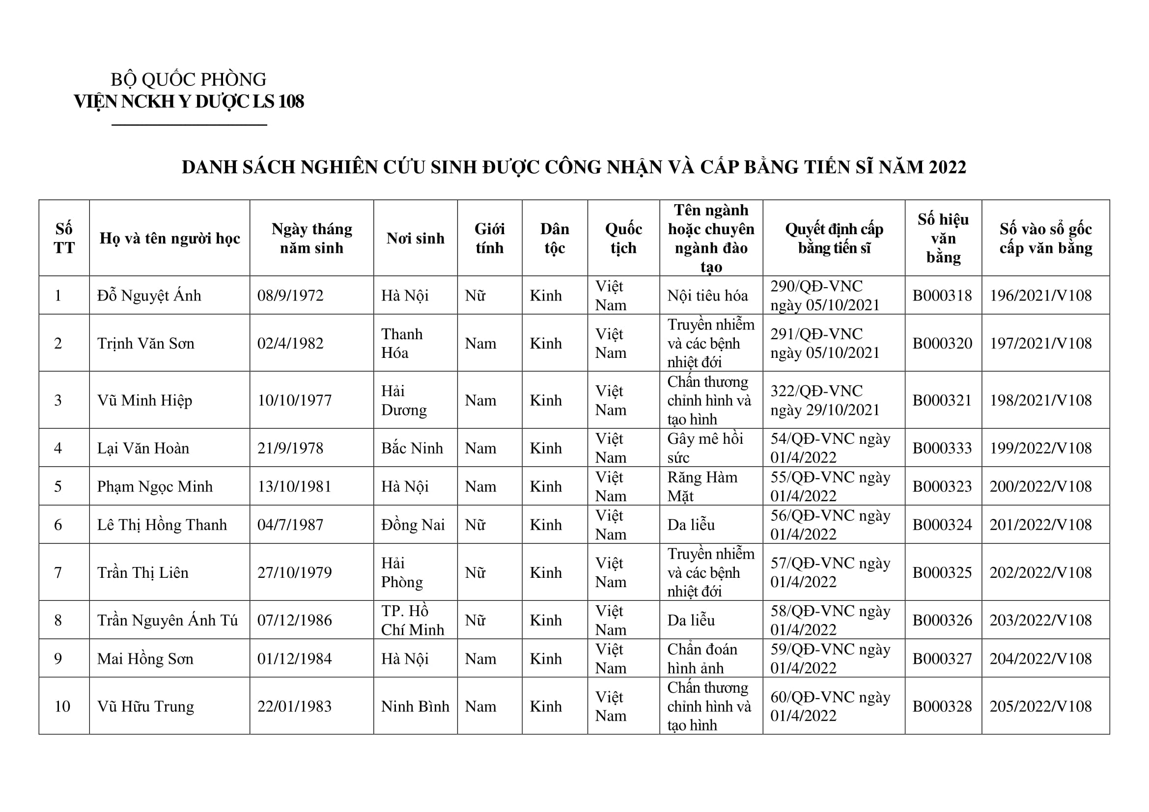 Danh sách nghiên cứu sinh được công nhận và cấp bằng tiến sĩ năm 2022