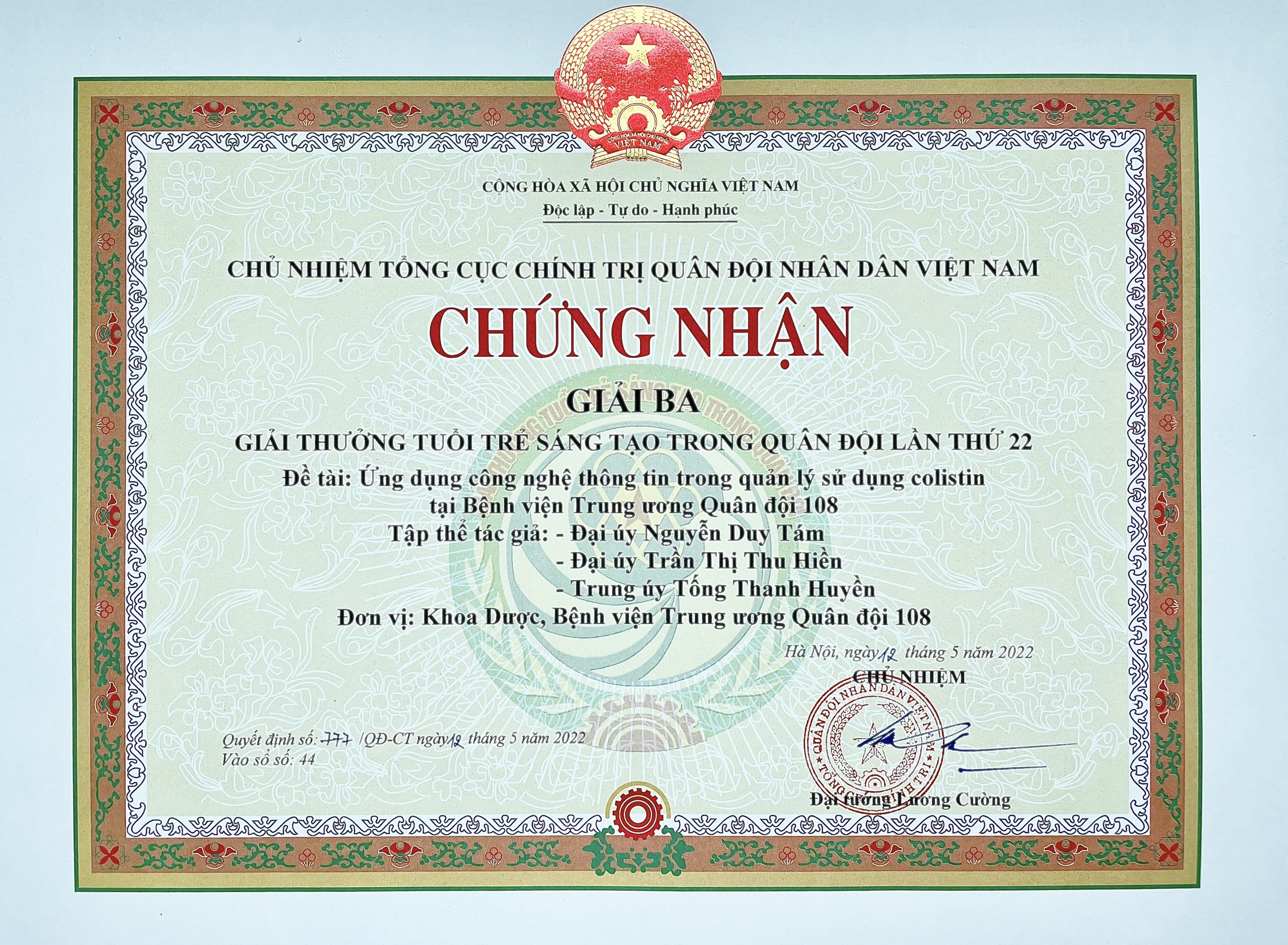 Chiều ngày 19/5, tại Hội trường Bộ Quốc phòng đã diễn ra lễ trao giải thưởng Tuổi trẻ sáng tạo trong quân đội lần thứ 22. Trong số các giải thưởng, đề tài “Ứng dụng công nghệ thông tin trong quản lý sử dụng colistin tại Nhà cái cá cược cá độ uy tín, game bài, casino, thể thao, nổ hũ, bắn cá” của Khoa Dược – Nhà cái cá cược cá độ uy tín, game bài, casino, thể thao, nổ hũ, bắn cá đã vinh dự được nhận giải Ba. Nhóm nghiên cứu là những dược sĩ trẻ đang công tác tại Khoa Dược – Nhà cái cá cược cá độ uy tín, game bài, casino, thể thao, nổ hũ, bắn cá (Đại úy Nguyễn Duy Tám, Đại úy Trần Thị Thu Hiền, Trung úy Tống Thanh Huyền)