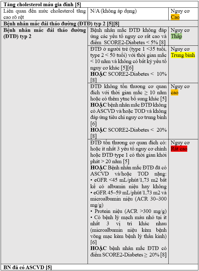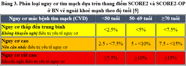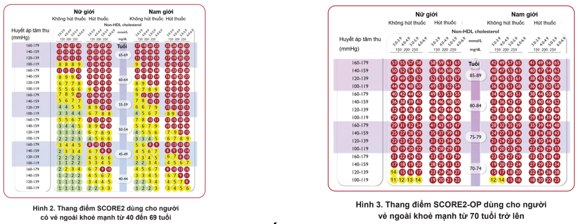 - Hướng dẫn của Hiệp hội Tim mạch Châu Âu năm 2021 (ESC 2021) đưa ra thang điểm SCORE [5]: Thang điểm giúp ước tính nguy cơ mắc ASCVD trong 10 năm cho người lớn không có ASCVD, đái tháo đường, bệnh thận mạn, bệnh lý lipid di truyền, áp dụng theo độ tuổi từ 40 – 69 tuổi sẽ được đánh giá theo SCORE2 và từ 70 tuổi trở lên sẽ được đánh giá theo SCORE2-OP. Các yếu tố được xem xét bao gồm tuổi, giới tính, huyết áp tâm thu, cholesterol toàn phần và tình trạng hút thuốc. Dữ liệu để phát triển các thang điểm này lấy từ quần thể người Châu Âu, tuy nhiên theo Hội Tim mạch học Việt Nam (VNHA), Việt Nam có mức tử vong do bệnh tim mạch tương đương với vùng nguy cơ cao của Châu Âu nên sẽ áp dụng thang điểm cho vùng nguy cơ cao [4].