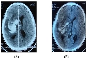 Hình 6. Hình ảnh cắt lớp vi tính sọ não trước mổ (A) và sau rút dẫn lưu (B)