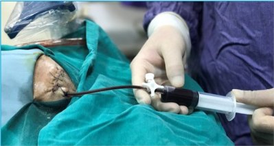 Hình 5. Hút máu tụ và bơm thuốc tiêu sợi huyết