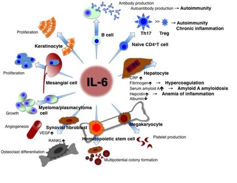 - Interleukin 6 (IL-6) được sản xuất kịp thời để đáp ứng tạm thời với nhiễm trùng và chấn thương mô, góp phần bảo vệ cơ thể thông qua việc kích thích phản ứng giai đoạn cấp tính, tạo máu và phản ứng miễn dịch. Mặc dù sự tiết ra của nó được kiểm soát chặt chẽ bởi các cơ chế phiên mã và hậu phiên mã, sự tổng hợp liên tục của IL-6 bị rối loạn có sự ảnh hưởng của tình trạng viêm mãn tính và tự miễn dịch.