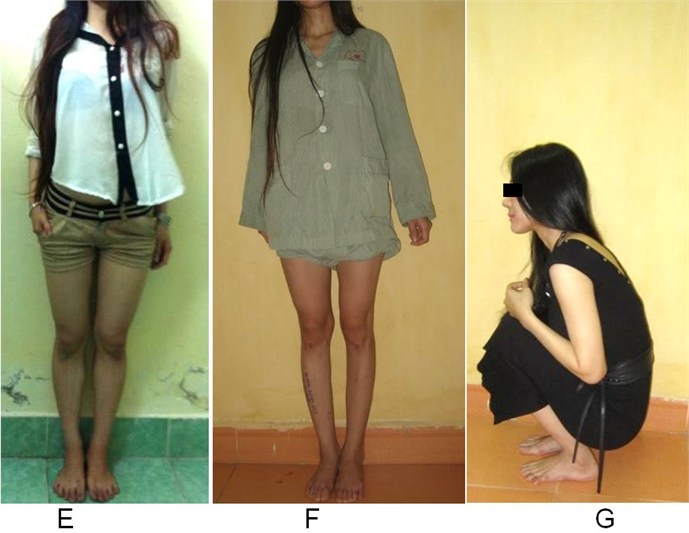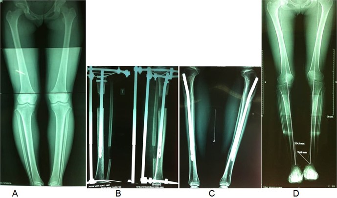 Hình ảnh minh họa một trường hợp nâng chiều cao 7cm: A, E: Hình ảnh X-quang và chiều dài chân bệnh nhân trước khi mổ; B: hình ảnh X-quang khi lắp khung kéo 2 cẳng chân dài 7cm; C: Hình X-quang ổ kéo dài xương đã liền chắc còn đinh nội tủy; D, F, G: Kết quả sau khi xương liền chắc, đinh được rút bỏ, bệnh nhân đi dứng và ngồi bình thường.