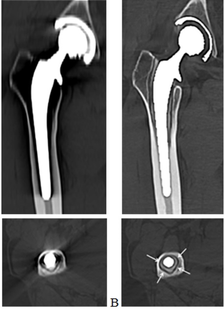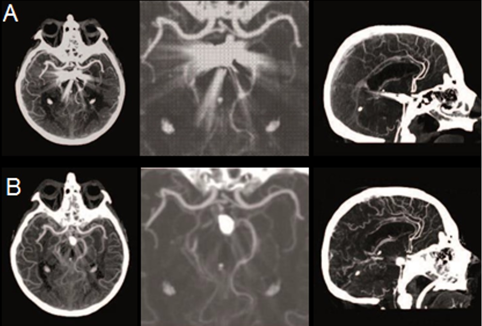 A: Hình ảnh chụp CLVT thường quy; B: Hình ảnh chụp CLVT 512 dãy sử dụng công nghệ giảm nhiễu ảnh kim loại