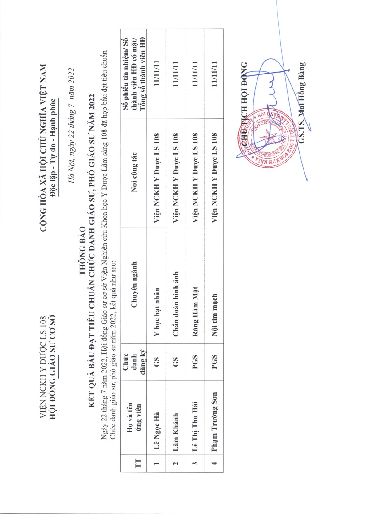 Thông báo: Kết quả bầu đạt tiêu chuẩn chức danh Giáo sư, Phó Giáo sư năm 2022