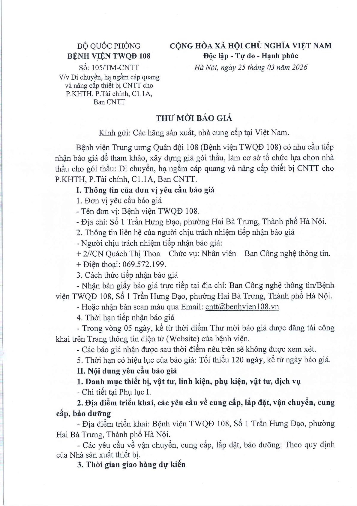 Thư mời chào giá số 105: Di chuyển, hạ ngầm cáp quang và nâng cấp thiết bị CNTT