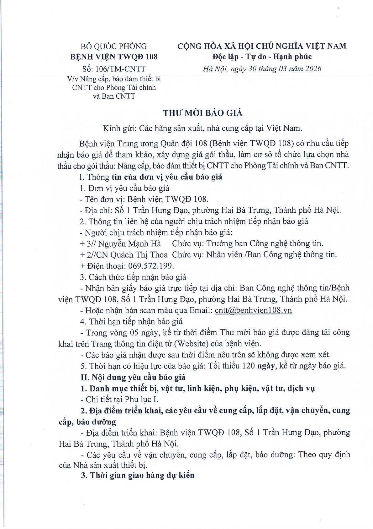 Thư mời chào giá số 106: Nâng cấp, bảo đảm thiết bị CNTT