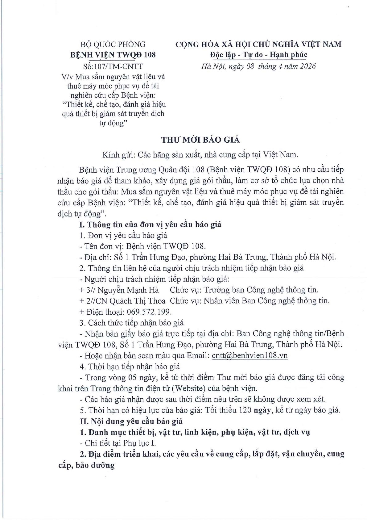Thư mời chào giá số 107: Mua sắm nguyên vật liệu và thuê máy móc phục vụ đề tài nghiên cứu cấp Hubet com cá cược thể thao
