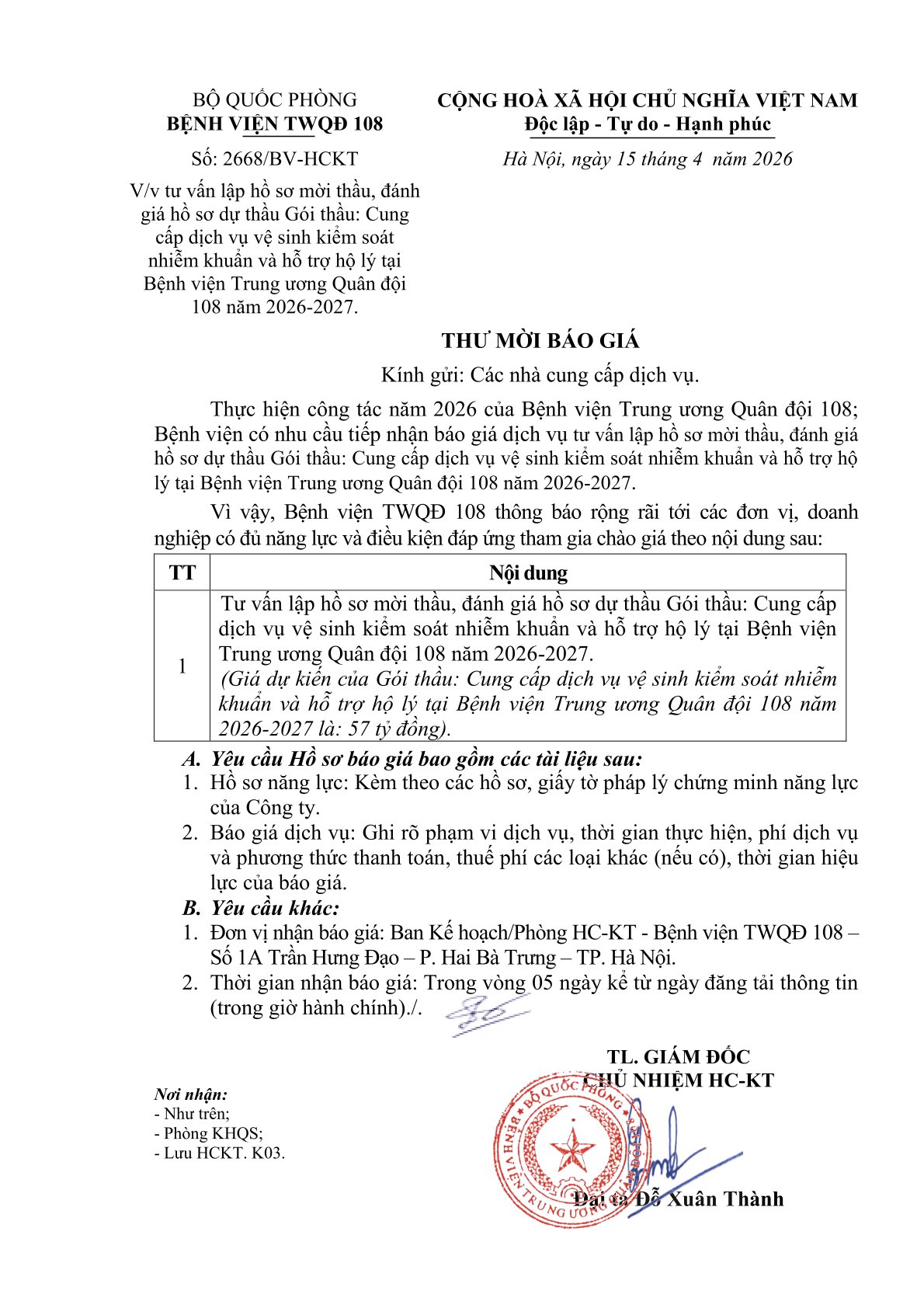 Thư mời chào giá số 2668: tư vấn lập hồ sơ mời thầu, đánh giá hồ sơ dự thầu Gói thầu: Cung cấp dịch vụ vệ sinh kiểm soát nhiễm khuẩn và hỗ trợ hộ lý tại Hubet com cá cược thể thao Trung ương Hubet7788 trò chơi trực tuyến 108 năm 2026-2027
