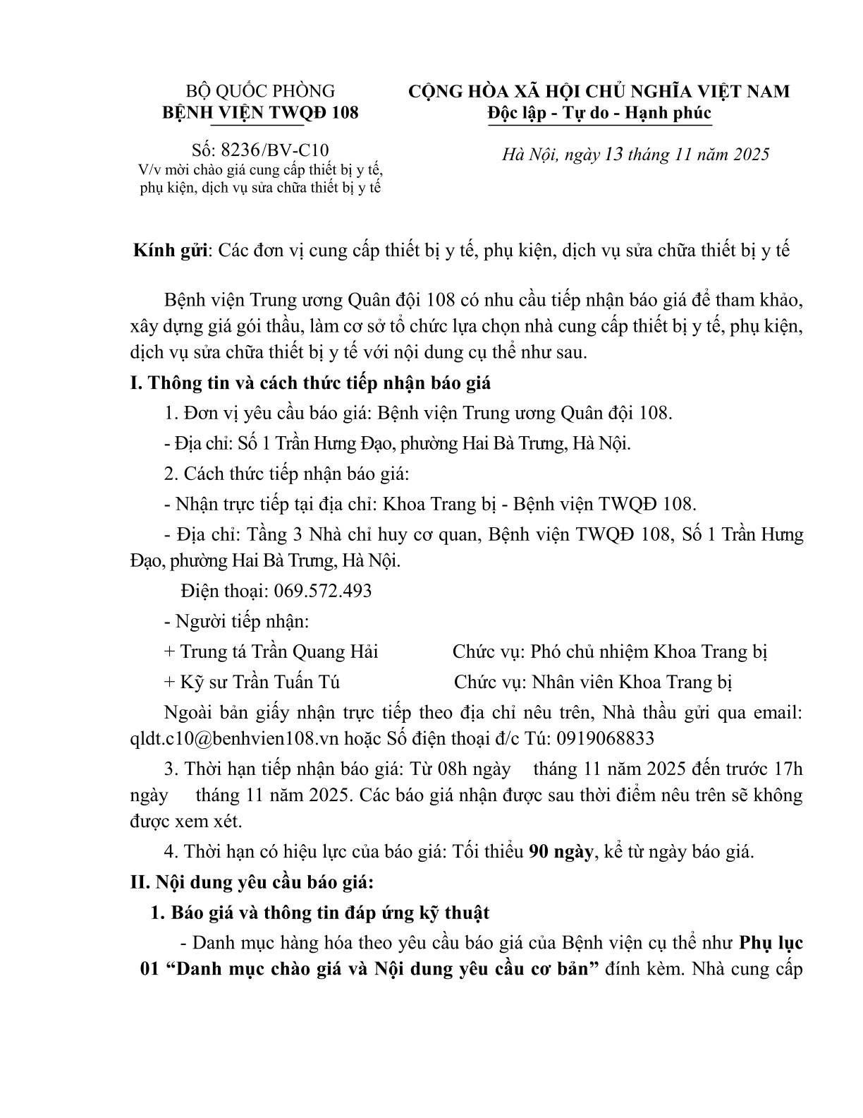 Thư mời chào giá số 8236: Mời chào giá cung cấp thiết bị y tế, phụ kiện, dịch vụ sửa chữa thiết bị y tế